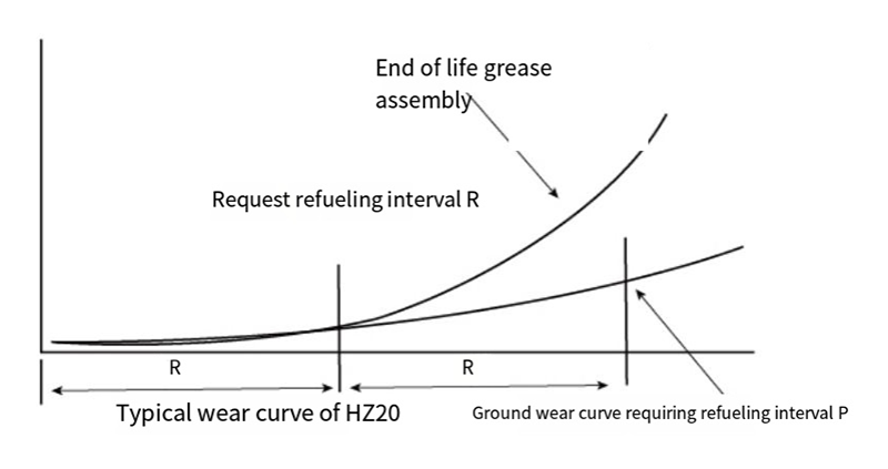 เมื่อติดตั้งบุช HZ20 โดยใช้จาระบี เช่น จาระบีที่ใช้ลิเธียมหรือซิลิโคน อายุการใช้งานจะแตกต่างจากค่า PV ภายใต้สภาพการทำงาน เช่น เมื่อค่า PV อยู่ที่ประมาณ 2.5MPam/s อายุการใช้งานจะอยู่ที่ประมาณ 200 ชม. เมื่อค่า PV เท่ากับ 0.1Mpa-m/s อายุการใช้งานอาจสูงกว่า I0,0oohr (ดูตารางสำหรับรายละเอียด) รอบ R ของการบำรุงรักษาการหล่อลื่นของบุช HZ20 คือประมาณครึ่งหนึ่งของอายุการใช้งาน ตัวอย่างเช่น เมื่อ PV=25Mpam/s จำเป็นต้องหล่อลื่นด้วยน้ำมันทุกๆ 100 ชม.